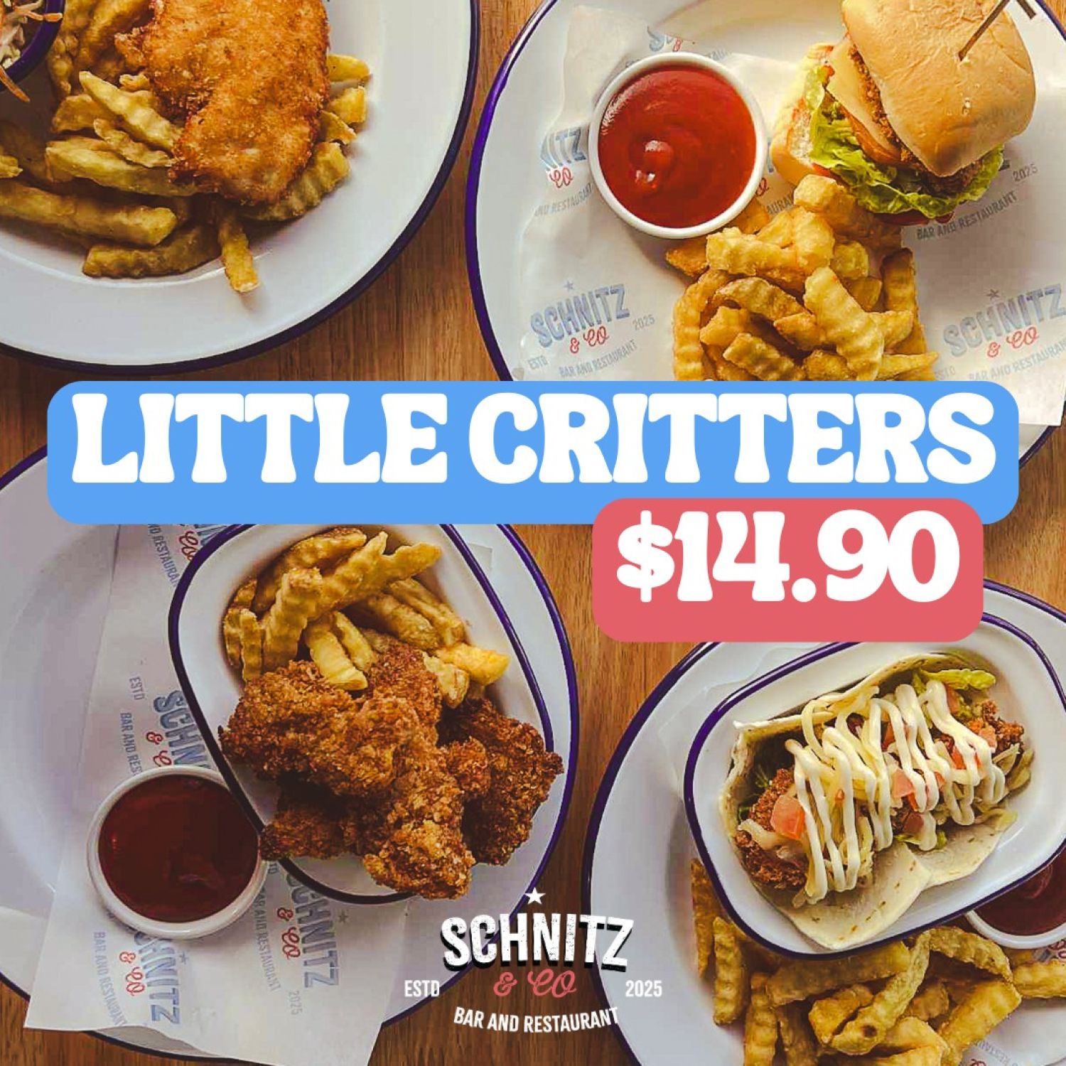 Our Little Critters kids meals are only $14.90 and come packed with their favourites – crispy schnitzel, nuggets, sliders or wraps with fries.